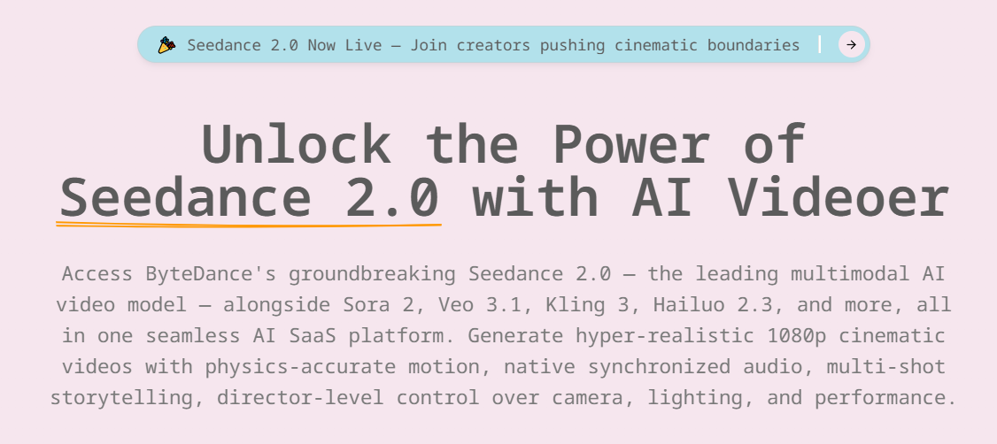 AI Videoer Generator v1.0 marks the launch of a revolutionary platform designed to centralize the world's leading AI video models. Generate high-quality cinematic content from a single, powerful dashboard.
